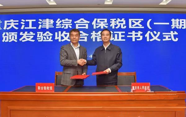 經(jīng)過認真評審后,聯(lián)合驗收組認為:重慶江津綜合保稅區(qū)(一期)已圍網(wǎng)的1.28平方公里范圍內(nèi)的基礎和監(jiān)管設施符合《海關特殊監(jiān)管區(qū)域基礎和監(jiān)管設施驗收標準》和國家有關法律法規(guī)的規(guī)定和要求,已具備封關運行條件,同意通過驗收。聯(lián)合驗收組與重慶市人民政府簽署了《重慶江津綜合保稅區(qū)(一期)驗收紀要》,并為江津綜保區(qū)頒發(fā)了(一期)驗收合格證書。